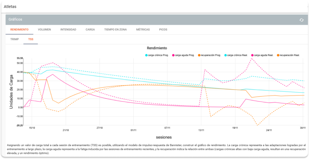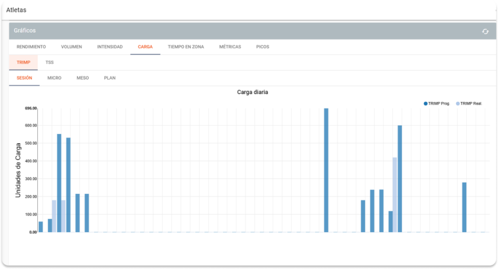 Compara la carga de entrenamiento realizada por los deportistas con la programada por el entrenador utilizando los modelos de TRIMP y TSS.