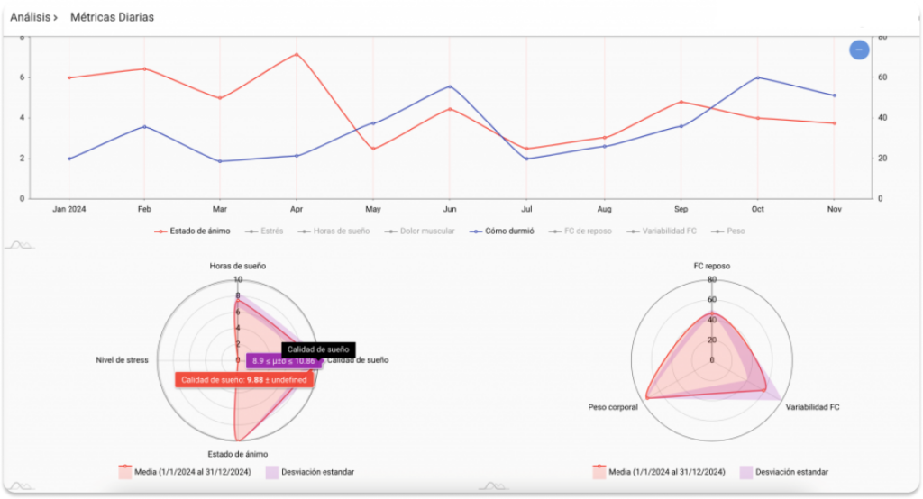 - La carga crónica, que refleja esencialmente un promedio de las cargas de cada sesión del último mes.