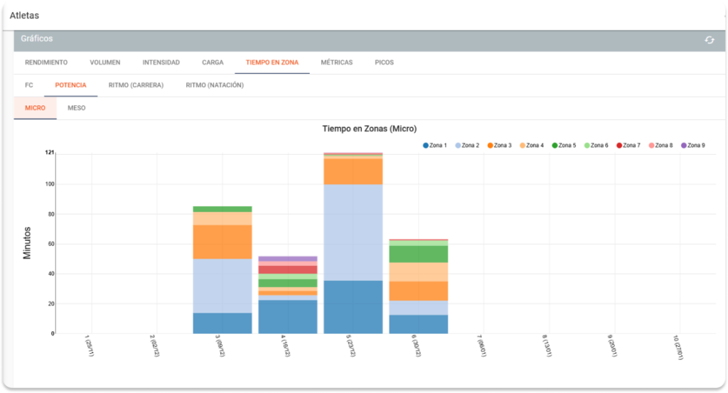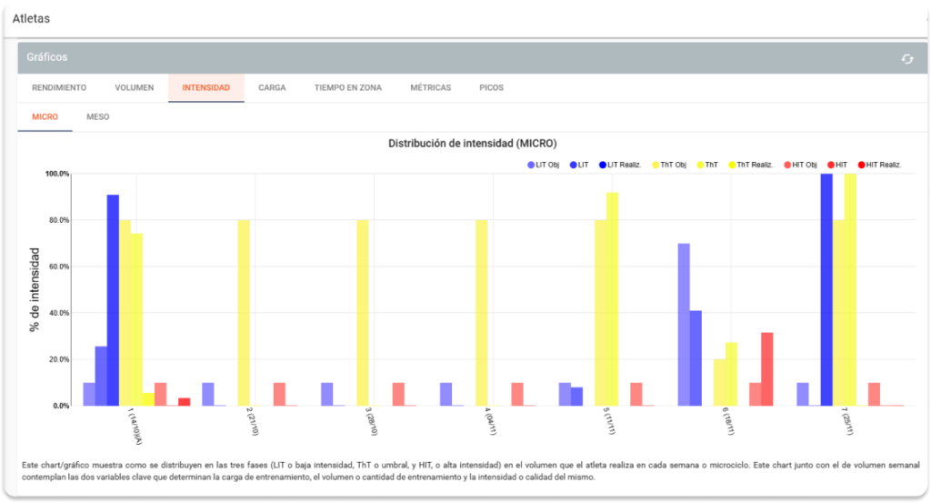 Lleva adelante un seguimiento de la intensidad del entrenamiento realizado por los deportistas, y compara el tiempo en cada fase (baja intensidad, umbral y alta intensidad) programado por el entrenador y el realizado por los deportistas semana a semana (microciclos) y mes a mes (mesociclos), año a año y cuantifica la distribución de la intensidad en tiempo y porcentaje (%).