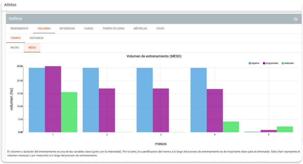 Lleva adelante un seguimiento del volumen de entrenamiento realizado por los deportistas, y compararlo con el programado por el entrenador, semana a semana (microciclos), mes a mes (mesociclos), año a año y cuantificar el volumen en tiempo (horas) o distancia (km).